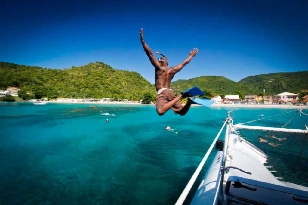 Le matin, le catamaran met le cap sur le célèbre Rocher du Diamant, naviguant à la voile. Si vous êtes chanceux, des dauphins pourraient accompagner votre trajet. Ensuite, découvrez les charmants villages de pêcheurs des Anses d’Arlet et terminez la matinée sur une plage de sable blanc. Profitez d’une baignade rafraîchissante et d’une plongée libre pour explorer les fonds marins.