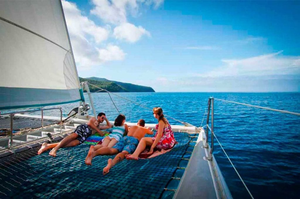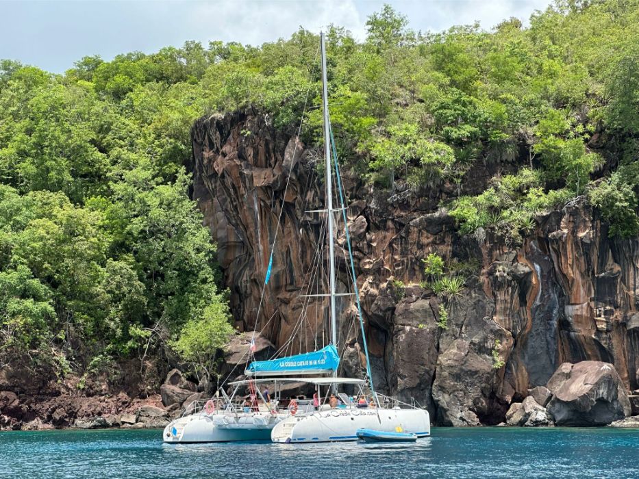 Excursions en maxi-catamaran en Martinique : Journée d’aventure maritime entre plages, dauphins et grottes aux chauves-souris.