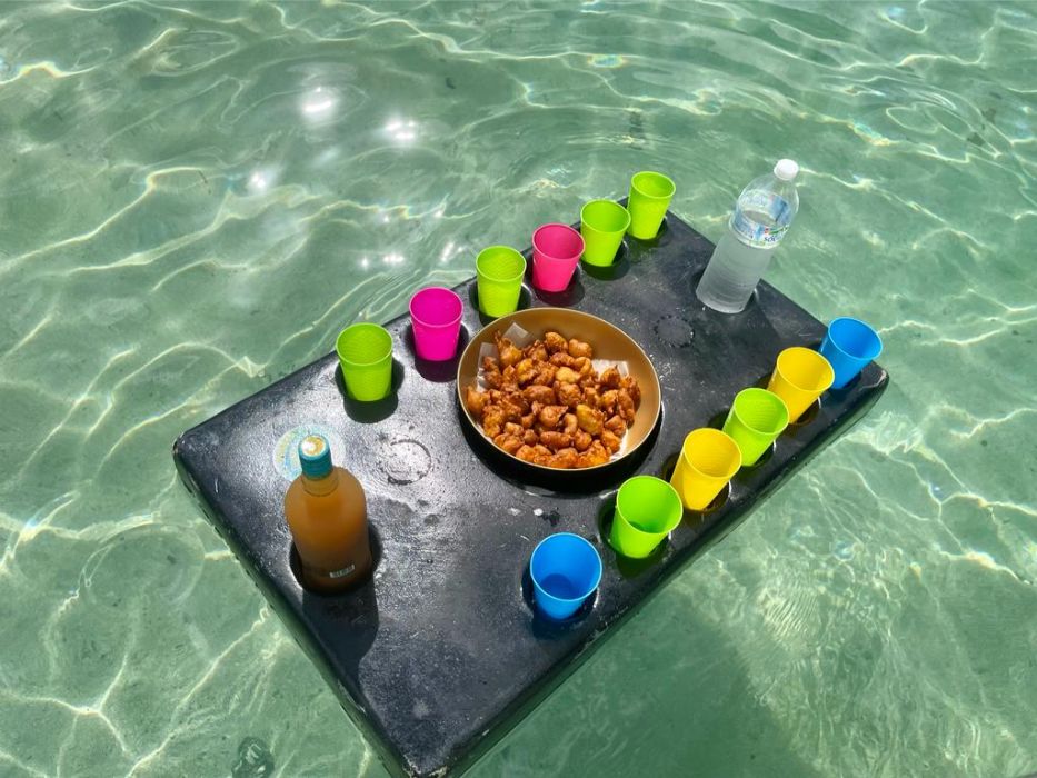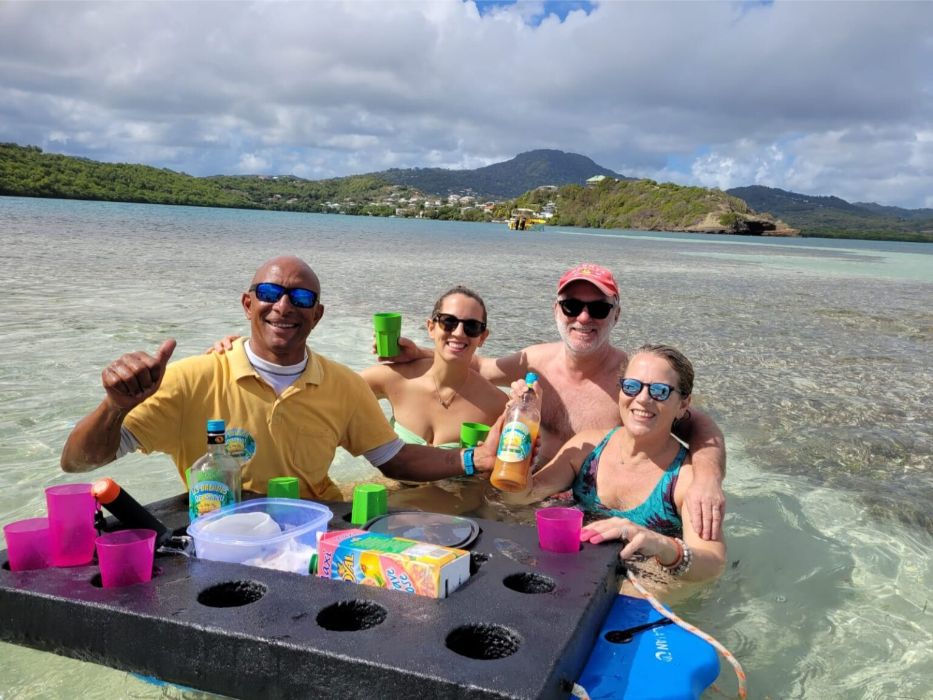 L’expérience inclut des arrêts baignade, des séances de snorkeling pour explorer les fonds marins, et bien sûr, des moments de détente autour d’un apéritif créole, avec ti-punch et accras.